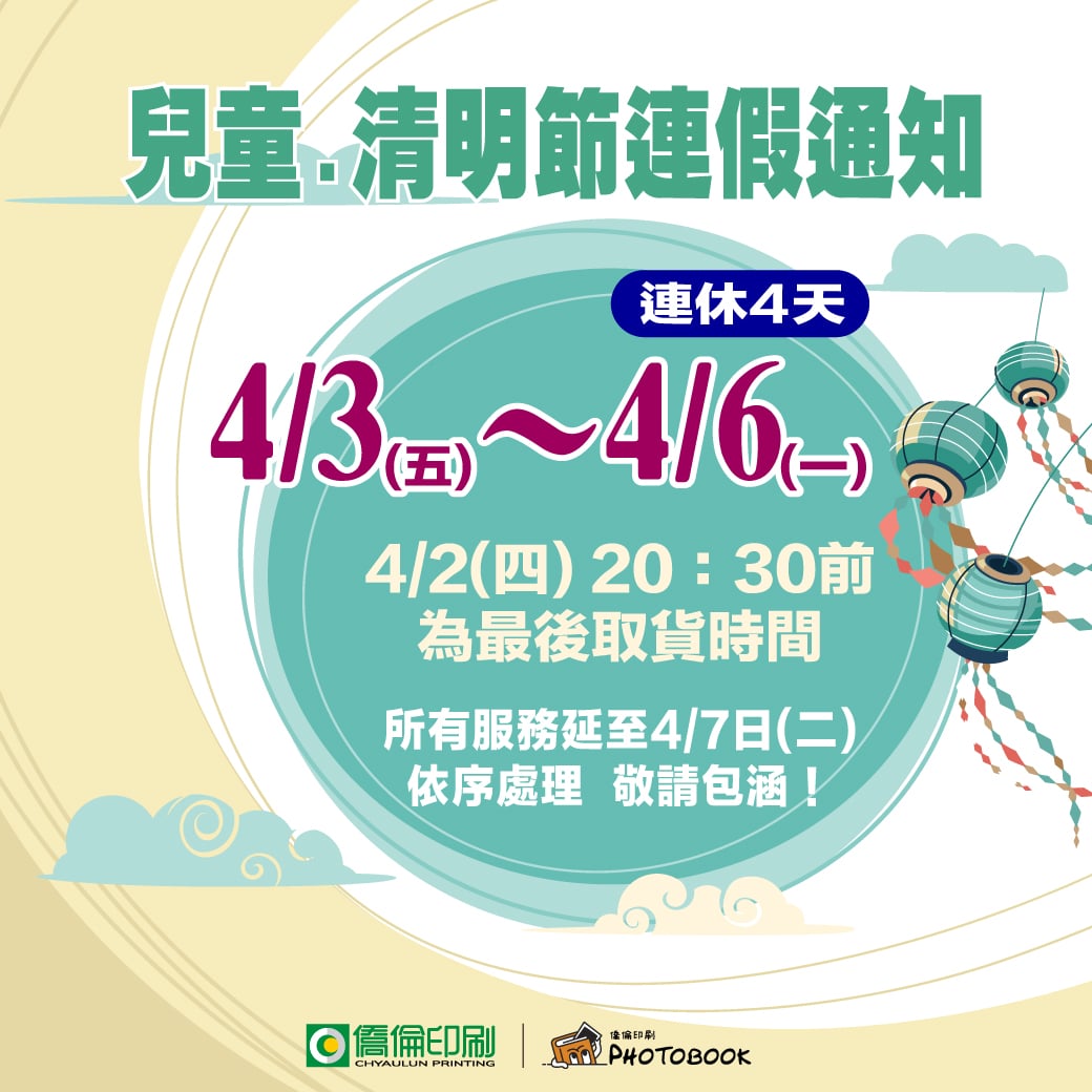 2026.04.02 (四) 晚間8:30前為休假前最後取貨時間。休假期間公司、客服、印刷人員皆休息